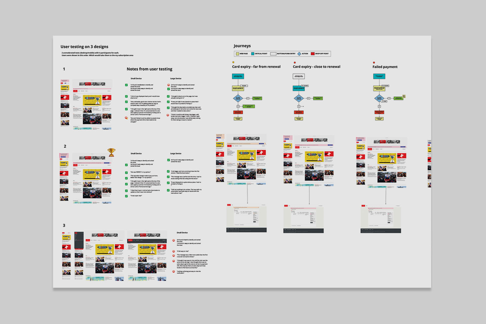 From research, we were able to build out key personas and some high-level user journeys for existing, lapsed, and prospective subscribers. I then started to map out user flows of the current journeys and consider any potential pain points. Alongside this, I started to sketch ideas to explore options before moving into low-fidelity wireframes.